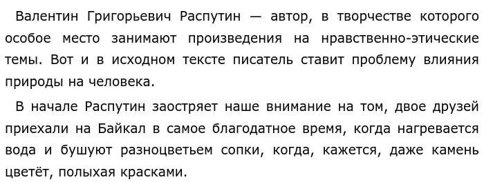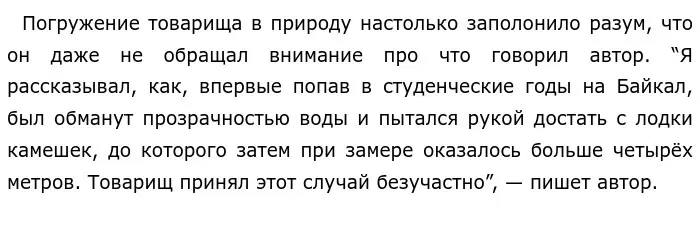 Далее писатель повествует о том, как товарища доконала нерпа. Повезло, что она плавала очень близко к берегу и товарищ, как маленький ребёнок радовался и подманивал её, посвистывая. “Байкал, казалось бы, должен подавлять человека своим величием и размерами — в нём всё крупно, всё широко, привольно и загадочно, а он, напротив, возвышает его”, — пишет автор. Эту цитату можно понять так: вместо того, чтобы подавлять человека своей силой, Байкал возвышает его и помогает почувствовать свою малость перед природой. На мой взгляд, авторский замысел состоит в том, что даже самые могущественные и величественные явления природы могут вызывать у человека не только страх, но и восхищение.