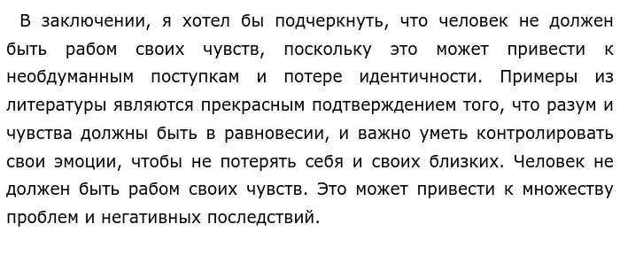 Чувства играют важную роль в нашей жизни. Они позволяют человеку выразить свои эмоции, чувства к близким и понять окружающий мир. Однако, когда человек становится рабом своих чувств, он теряет контроль над собой и своими поступками. В данном сочинении я обосновываю, почему человек не должен быть рабом своих чувств и привожу два примера из художественной литературы для подтверждения своих слов.