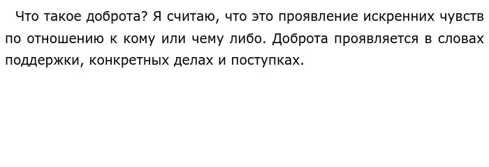 Итак, можно сделать вывод о том, что быть добрым значит проявлять сочувствие, оказывать поддержку, безвозмездно помогать другим. Быть добрым может каждый, для этого не нужны особые усилия. Делая добрые дела, мы показываем другим, что нам не безразличны их проблемы и переживания. Проявляя доброту, мы делаем этот мир и общество лучше.