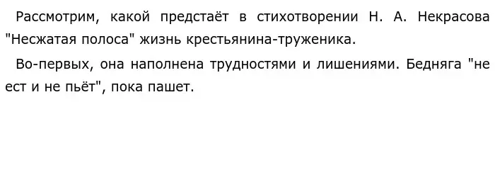 Таким образом, жизнь крестьянина-труженика предстаёт в стихотворении Н. А. Некрасов "Несжатая полоса" тяжёлой и полной лишений.