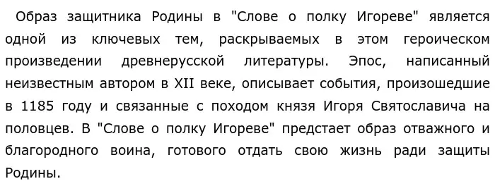 Образ защитника Родины в "Слове о полку Игореве" является символом русской национальной идентичности и патриотизма. Он передает ценности и идеалы древнерусской культуры, включая готовность жертвовать собой для защиты Родины и верность князю. Эпос прославляет отвагу и благородство воинов, а также подчёркивает важность единства и коллективного действия для достижения победы.