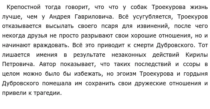Яркий пример похожего разрыва взаимоотношений можно найти в романе А. С. Пушкина "Дубровский", в котором показано, как дружба двух армейских товарищей Кирилы Петровича и Андрея Гаврииловича превратилась во вражду. Они жили неподалеку друг от друга в Покровском. Несмотря на разное социальное положение, Троекуров и Дубровский ладили друг с другом. Но эти взаимоотношения начинают рушиться от одного глупого случая: Кирила Петрович, позволяя наглость своему крепостному, смеется с его слов, сказанных в ответ на замечание Дубровского о том, что троекуровские собаки живут лучше крестьян.