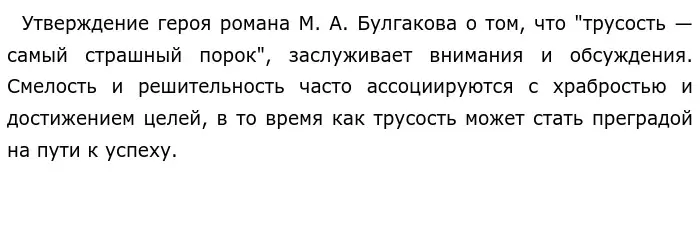 Согласно утверждению героя романа М. А. Булгакова о том, что "трусость — самый страшный порок", можно сказать, что это утверждение имеет право на существование, но оно не всегда абсолютно верно. Трусость может стать преградой на пути к достижению целей и мечт, но она также может быть временным состоянием, которое человек может преодолеть с помощью внутренней силы и решимости. Важно понимать, что трусость - это человеческое чувство, и оно может быть преодолено или пережито. В конечном итоге, страхи и сомнения не всегда являются пороком, но они могут быть преодолены с помощью уверенности и решительных действий.