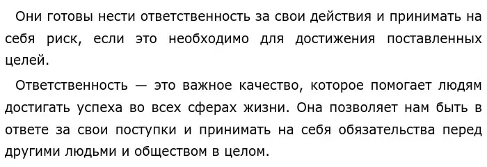 Ответственность — это способность человека отвечать за свои поступки и принимать на себя обязательства перед другими людьми и обществом в целом. Это качество характера, которое проявляется в том, что человек готов нести последствия своих действий и готов взять на себя ответственность за свои ошибки.