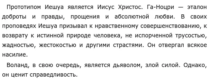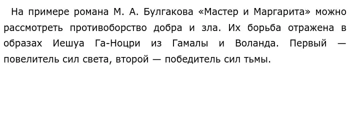 Противопоставляя двух героев, автор показывает, что добро и зло неразрывно связаны. На протяжении всего романа М. Булгаков переносит читателя то в Москву тридцатых годов, где «царствует» Воланд, то в Ершалаим. Таким образом, по мнению писателя добро и зло совместно и независимо участвуют в едином историческом процессе.