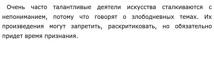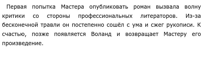 В подтверждение своих слов, хочу обратиться к произведениям русской литературы. Например, в романе М. А. Булгакова «Мастер и Маргарита» затрагивается тема вечного искусства. Бывший историк Мастер, выиграв в лотерею крупную сумму денег, пишет книгу о Понтии Пилате и Иешуа Га-Ноцри, которая затрагивает многие общественные проблемы и глубокие философские вопросы, актуальные во все времена. Казалось бы, произведение должно непременно принести успех его автору. Однако, в реальности всё получается иначе.
