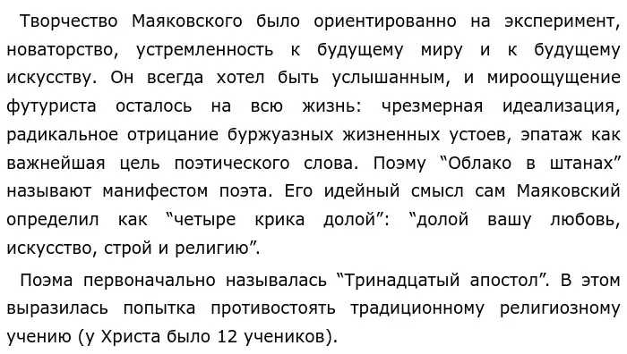 Тему бунта героя Маяковский раскрывает с помощью множества средств выразительности, например, неологизмов: “выжиревший”, “изъиздеваюсь”, “любёночек”, а также с помощью метафор: “буду дразнить об окровавленный сердца лоскут”, “в душе ни одного седого волоса” и “губы спокойно перелистывает”. В произведении мы видим агрессивную лексику, богохульство, уличную грубость — всё это подчеркивает бунтарскую стихию поэмы.