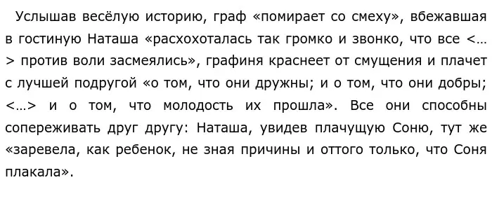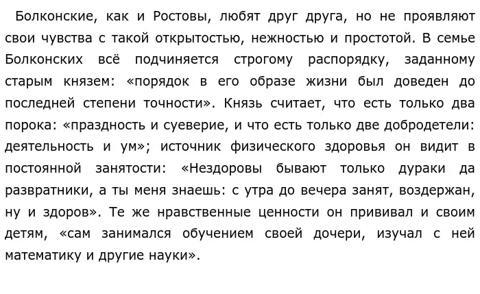 Если Ростовы — это олицетворение открытости всех чувств, эмоциональности, искренности и душевности, то Болконские — это олицетворение разума, патриотизма, чести, достоинства и веры. Обе семьи отличаются гармонией отношений, в них царит любовь, понимание и уважение друг к другу. (829 слов)