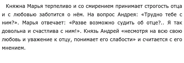 В семье Болконских отношения ровные и спокойные, каждый из них занимается своим делом и знает свое место. В этой семье не так ярки проявления эмоций, никто не бросается друг другу в объятия, не смеётся от радости и не плачет от горя. Здесь все чувства выражаются сдержанно: князь «радостно из-под своих густых нависших бровей косился на сына», а чувства княжны Марьи можно угадать по её «большим, глубоким и лучистым» глазам. Они не привыкли открыто выражать свои эмоции, как Ростовы, но эта особенность не делает их чёрствыми и холодными. Они так же понимают и принимают слабости друг друга и относятся друг к другу с любовью и заботой.