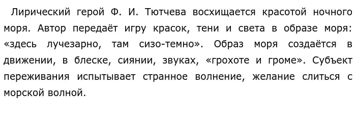 В стихотворении Ф. И. Тютчева «Как хорошо ты, о море ночное…» отражаются такие переживания лирического героя, как восхищение красотой и величием ночного моря. В этом философском лирическом произведении герой чувствует растерянность перед силой и мощью морской стихии.