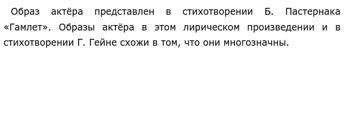 Лирический герой Г. Гейне не только искусный актёр, который страстно декламирует и разыгрывает драму на сцене, но и несчастный влюблённый, страдающий от неразделённой любви. Субъект высказывания Пастернака играет на сцене роль Гамлета, решая сложный вопрос: быть или не быть. Но в нём совмещаются и образ Иисуса Христа, который в Гефсиманском саду молит Господа пронести мимо чашу мук и страданий.