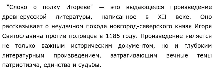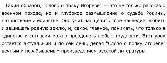 "Слово о полку Игореве" также пронизано глубоким чувством патриотизма. Любовь к Родине, её природе, традициям и культуре ощущается в каждой строчке произведения. Автор мастерски использует живописные описания природы, чтобы подчеркнуть красоту и величие русской земли. Этот патриотический пафос был и остаётся важным элементом национальной идентичности русского народа.