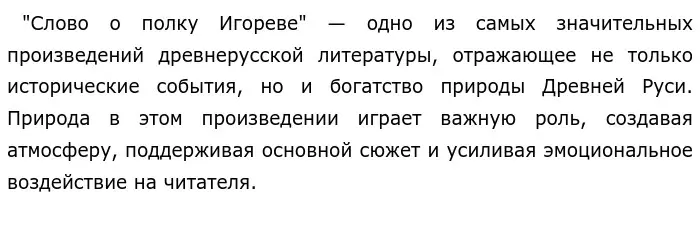 Таким образом, природа в "Слове о полку Игореве" не просто фон для событий, а активный участник повествования. Она помогает создать атмосферу, подчеркивает эмоции героев и символизирует важные аспекты древнерусской жизни. Природа становится олицетворением силы, величия и красоты родной земли, что делает произведение еще более значимым и глубоким.