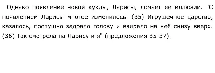 Лариса становится образцом для подражания, она вызывает у девочки не только зависть, но и некое уважение. В этой ситуации мы видим, как внутренний мир девочки меняется, она начинает осознавать свои комплексы, свою склонность к власти и неуверенность в себе.