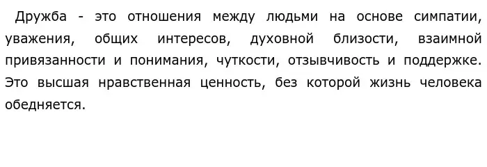 Исходя из всего вышесказанного, следует, что настоящая дружба заключается во взаимопонимании, помощи, поддержке. Настоящее друзья никогда друг друг не завидуют и не предают.