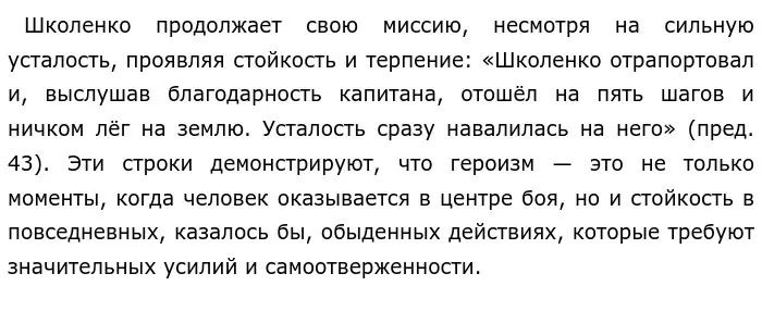 Позиция автора в тексте ясна: героизм проявляется не только в военных подвигах, но и в личной ответственности, моральной стойкости и заботе о своих товарищах. Школенко — не романтический герой, он не ищет славы, но исполняет свой долг с полной отдачей и стойкостью.