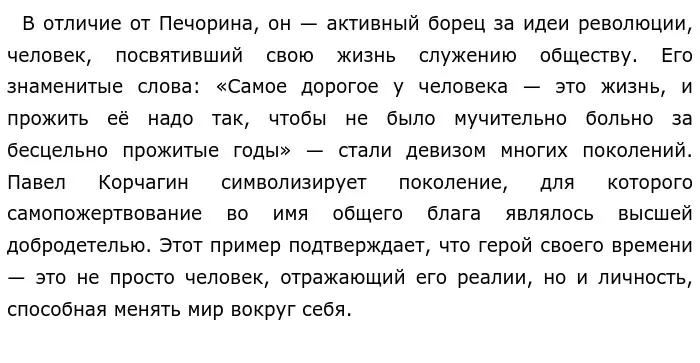 Таким образом, героями своего времени становятся люди, которые либо олицетворяют внутренние конфликты эпохи, как Печорин, либо вдохновляют других своими убеждениями и поступками, как Корчагин. Литература помогает понять, что время рождает своих героев в зависимости от исторических и социальных условий. Они могут быть разными, но всегда являются отражением своей эпохи.