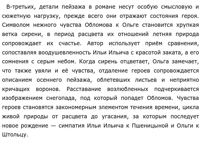 Итак, подробно проанализировав фигурирующие в романе значимые подробности, можно сделать вывод, что черты портрета Обломова отражают его мягкий и умиротворенный внутренний мир, детали интерьера подчеркивают отношение героя к быту, его ценности и жизненные ориентиры, а элементы пейзажа подробно раскрывают чувства Ильи Ильича и сопровождают историю его любви.