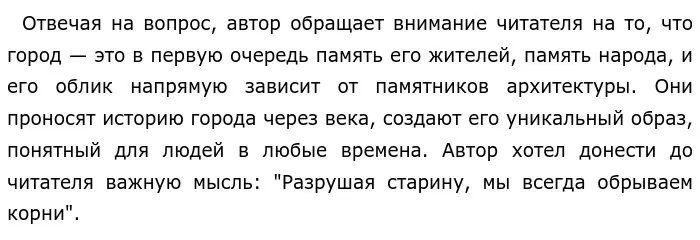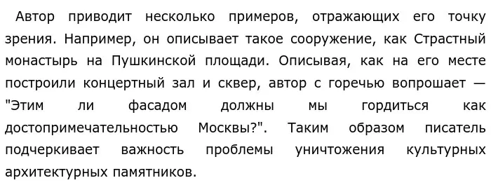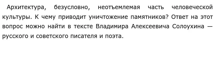 Эти два примера-иллюстрации сопоставлены между собой, ведь в этих примерах описывается, как важные для людей строения разрушают, лишая людей возможности гордиться и чтить историю. Авторская позиция ясна: Солоухин считает, что, разрушая памятники — мы разрушаем неповторимый образ города, в котором заключается вся красота и весь его интерес.