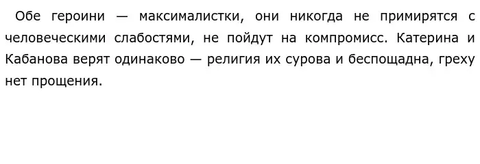 Катерина чиста душой, трепетно относится к Богу, боится греха, внутренние моральные устои не позволяют ей лгать, притворяться. Главное для героини быть свободной, поэтому выйдя замуж и подвергаясь "нападкам" свекрови она несчастна. Измена законному супругу для Катерины — величайший грех, но жить без любви она тоже больше не может. Внутренний конфликт для героини становится невыносим, она не хочет больше оставаться в "тёмном царстве", но и уехать с Борисом невозможно, поэтому решается на самоубийство.