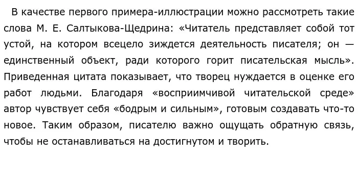 Примеры противопоставлены друг другу. Сначала автор пишет о важности поддержки читателей, ведь это помогает писателю в развитии, а далее упоминает о негативных последствиях ситуации, когда творец загнан в рамки аудитории. Таким образом, проблемный вопрос раскрывается с разных сторон.