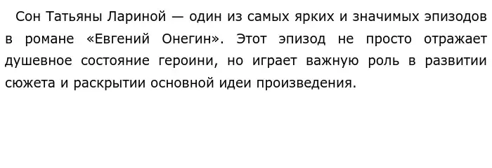 Таким образом, сон Татьяны — это не просто художественный приём, а важный композиционный и смысловой элемент романа. Он помогает раскрыть внутренний мир героини, предвосхищает дальнейшие события и углубляет философскую проблематику произведения. Через этот эпизод Пушкин показывает, как переплетаются в романе реальность и фантастика, личное и общечеловеческое, народная мудрость и светская культура.