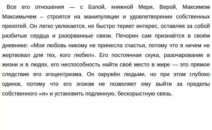Таким образом, произведения Лермонтова убедительно демонстрируют, что эгоизм и одиночество являются двумя сторонами одной медали. Чем больше человек замыкается на своих желаниях и потребностях, тем глубже становится пропасть между ним и окружающим миром. Неспособность к эмпатии, манипуляция другими ради собственной выгоды, гордыня — всё это разрушает мосты к другим людям, обрекая эгоиста на мучительное и неизбежное одиночество. Истинная связь и счастье возможны лишь тогда, когда человек способен выйти за рамки собственного «я» и открыть своё сердце для других.