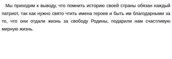Зачем людям знать историю своей страны? На мой взгляд, каждый гражданин своей страны, должен знать отечественную историю, потому что мирная жизнь подарена нам предками, которые защищали родную землю от врагов. Нужно хранить память о героях и быть благодарными им за то, что они завоевали потомкам счастливое будущее. Приведу примеры, подтверждающие эти мысли.