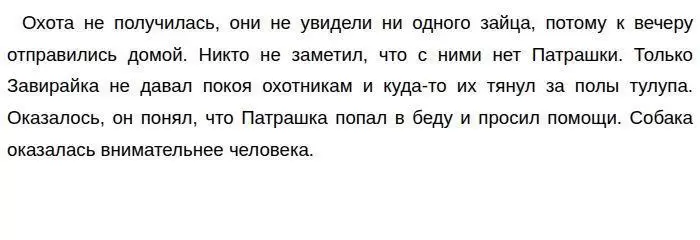 Далее охотники отправились за Завирайкой, который быстро привёл их к снежному бугру, где увидели попавшего в капкан Патрашку. Как же радовался Завирайка, когда бедную собаку освободили от капкана! Он как будто благодарил охотников. Так сообразительность и чуткость Завирайки помогла спасти Патрашку.