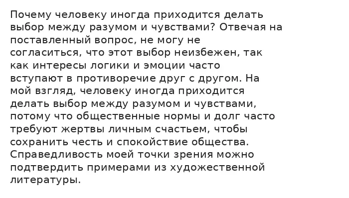 В одном из эпизодов в произведении А. С. Пушкина "Евгений Онегин" героиня Татьяна Ларина делает тяжелейший выбор в пользу разума и долга. Когда Евгений признается ей в любви спустя годы, она, несмотря на сохранившиеся чувства к нему, отвергает его предложение. Татьяна объясняет это тем, что она выдана замуж за другого и должна хранить верность своему мужу, даже если не любит его. Она говорит: "Но я другому отдана; я буду век ему верна". Этот поступок требует от неё огромного усилия воли, чтобы подавить любовь ради нравственного принципа. Несомненно, такая судьба подтверждает, что почему человеку иногда приходится делать выбор между разумом и чувствами, заключается в необходимости соблюдения моральных обязательств, которые важнее личного удовлетворения.