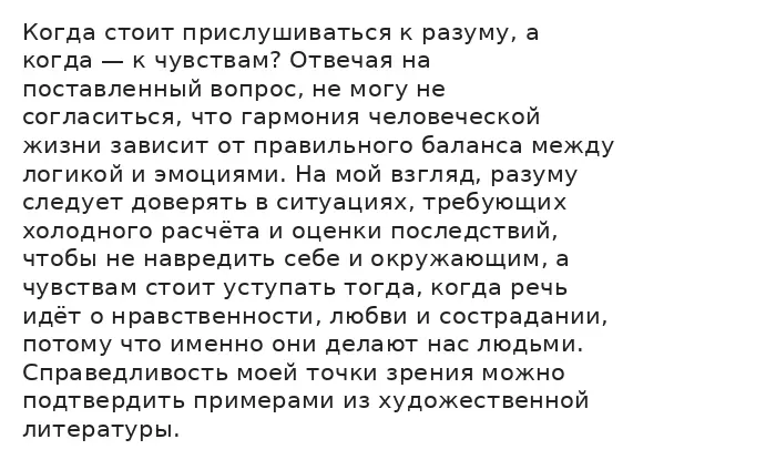 Итак, размышляя над предложенной темой, я поняла, как важно находить золотую середину между разумом и чувствами. Нельзя полностью отвергать логику, но и нельзя позволять ей заглушать человеческое в человеке. Только союз разума и чувств позволяет принимать верные решения и оставаться достойным человеком в любых обстоятельствах жизни.