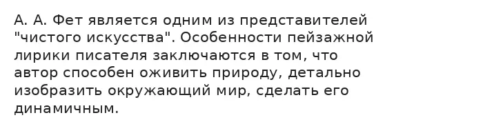 Подводя итог, можно сказать, что особенности пейзажной лирики А. А. Фета заключаются в том, что автор одушевляет природу, чтобы подробнее изобразить её. Используя детали, писатель изображает красоту окружающего мира в мелочах. Наполняя природу чувствами, оживляя её, Фет делает пейзаж более динамичным.