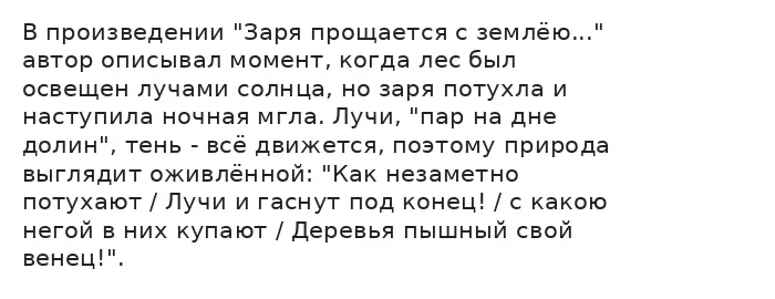 Так, в стихотворении "Вечер" Фет использует приём олицетворения, чтобы наделить природу свойствами живого существа: "Убегает на запад река". В первой строфе произведения автор использует неполные предложения, тем самым создавая собирательный образ всего окружающего мира. Фет также использует олицетворение: "Прозвучало над ясной рекою, / Прозвенело в померкшем лугу, / Прокатилось над рощей немою...". Таким образом, автор оживляет природу, чтобы подробнее изобразить окружающий мир в переходном состоянии.