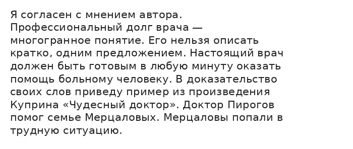По мнению автора, профессиональный долг врача заключается в готовности помочь любому человеку, попавшему в сложную ситуацию. Настоящий врач должен оставаться врачом вне своей работы, помогать всеми силами больному. Для подтверждения своих слов приведу примеры-иллюстрации из исходного текста.