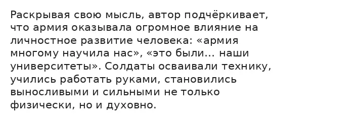 Особое внимание автор уделяет нравственному опыту. Он пишет, что армия «научила нас мужской дружбе», а также вспоминает, как изменилось его восприятие окружающего: слово «дом» стало относиться к землянке, а забота о солдатах проявлялась в вопросе «Покормили людей?». Этот пример иллюстрирует, как армия формирует чувство товарищества, ответственности за других и способность ценить простые человеческие отношения.