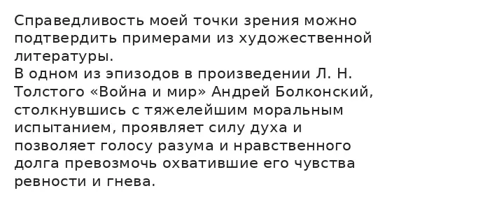 Кроме того, примером, который доказывает мою правоту, может служить и эпизод из повести А. С. Пушкина «Капитанская дочка». Пётр Андреевич Гринёв, оказавшись в руках бунтовщиков и лично столкнувшись с Пугачёвым, твёрдо выбирает путь чести, позволяя рассудку и верности присяге взять верх над естественным страхом и желанием сохранить жизнь любой ценой. Когда ему предлагают перейти на сторону самозванца, поцеловать ему руку и присягнуть, Гринёв внутренне переживает смятение: он чувствует любовь к Маше, понимает опасность положения, но разум чётко диктует ему единственно возможный выбор. Он отказывается от предательства, мотивируя это тем, что дворянская честь и воинская присяга несовместимы с изменой. Его спокойный, рассудительный ответ поражает даже самого Пугачёва, который, оценив силу характера, милует юношу. Подобная история свидетельствует о том, что разум способен преодолеть чувства страха и личного желания, когда речь идёт о сохранении чести, верности долгу и нравственным принципам, которые человек ставит выше сиюминутных эмоций.