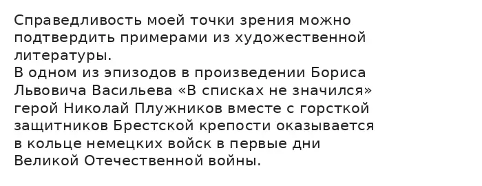 Другим примером, который доказывает мою правоту, служит эпизод из романа Фёдора Михайловича Достоевского «Преступление и наказание», где Родион Раскольников решает пойти на преступление ради воплощения своей теории о праве сильной личности переступать через моральные законы. Он стремится к победе над собственной бедностью и нищетой «любой ценой», включая жизнь старухи-процентщицы, полагая, что ради «великих свершений» допустимо отнять чужую жизнь. Однако автор показывает, что такая победа оборачивается трагедией: Раскольников теряет душевный покой, разрывает связи с матерью и сестрой, погружается в болезненное отчуждение и в итоге вынужден признаться в содеянном, неся наказание на каторге. Его попытка добиться успеха ценой крови приводит не к возвышению, а к духовному падению, разрушению совести и потере веры в себя. Подобная история свидетельствует о том, что стремиться к победе любой ценой недопустимо, когда речь идёт о нарушении нравственных законов, убийстве ближнего или попрании человеческой жизни, потому что такая «победа» лишается всякого смысла, превращаясь в путь к саморазрушению и моральной гибели.