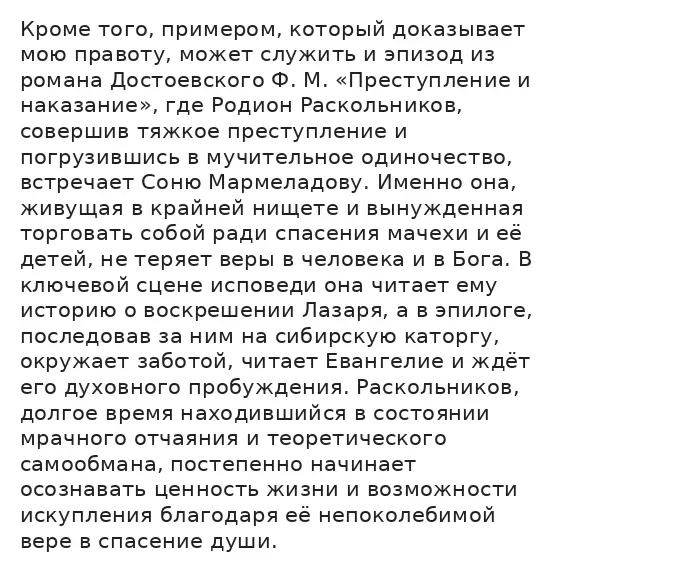В одном из эпизодов в произведении Шолохова М. А. «Судьба человека» главный герой Андрей Соколов, пройдя через ужасы фашистского плена, потери родных, разорённый дом и смерть сына в последний день войны, оказывается на грани полного уничтожения. Он бродит по разрушенным улицам, чувствуя себя совершенно одиноким в огромном мире, где уже некого ждать и некому ждать его. Однако, встретив у старой чайной осиротевшего мальчугана Ванюшку, он не проходит мимо. Андрей Соколов называет себя его отцом, делится с ребёнком скудным куском хлеба, берёт его за руку и уходит вместе с ним, осознавая, что теперь несёт полную ответственность за новую, ещё не сломанную жизнь. Этот поступок рождается не из логического расчёта, а из глубинной потребности спасти хоть кого-то в своём разрушенном мире и наполнить пустоту заботой. Несомненно, такая история подтверждает, что надежда действительно сопровождает человека до самого финала и выступает мощным механизмом психологического выживания, позволяющим находить скрытый смысл и силы для продолжения пути, когда все внешние опоры уже рухнули.