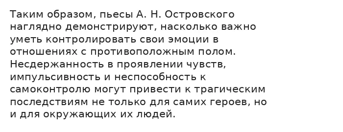 Взаимоотношения полов в произведениях Островского показывают, как важно уметь выражать свои чувства разумно. Герои, не умеющие управлять эмоциями, либо становятся жертвами манипуляций, либо сами причиняют боль близким людям.