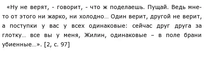 Сравним два сна, в которых появляется один и тот же эпизодический персонаж – вахмистр Жилин. В сне Алексея Турбина заведомо погибший два года назад вахмистр Жилин является вместе с ещё живым полковником Най-Турсом. На обоих «странная форма»: распространяющая свет кольчуга (а у Най-Турса ещё и шлем). Най-Турс при этом назван крестоносцем, а Жилин витязем. Вероятно, этой разницей автор хотел подчеркнуть «всемирную принадлежность Най-Турса и «национальную» - Жилина. Крестовые походы связывают людей разных национальностей, но одной идеологии, а витязями называют воинов в русских сказках. В такой же излучающей свет кольчуге появляется Жилин и в самом конце романа во сне красноармейца-часового. Жилин во сне красноармейца «наплывает» братски, и тот узнаёт в нём своего земляка, деревенского жителя. Когда-то они жили в одном селе под названием Малые Чугры. Образ Жилина, несомненно, имеет символический подтекст. Появляясь и во сне белогвардейца Алексея Турбина, и во сне безымянного красноармейца, Жилин объединяет врагов, противостоящих друг другу. Жилин попадает в рай ещё до начала Гражданской войны и оказывается «над схваткой», он свой и для белых, и для красных. Жилин – это идеальный образ русского воина, защитника отечества. На это указывают многие детали в создании этого образа: крестьянское происхождение, надетая на нём кольчуга, название «витязь» в раю, высшая солдатская должность вахмистра на земле, народная речь. Фамилия Жилин заставляет вспомнить персонажа из «Кавказского пленника» Л. Н. Толстого, в котором герой имеет неунывающий народный характер. В отличие от своего товарища по несчастью Костылина, Жилин в плену у горцев не теряет присутствия духа. Ему удаётся в тяжёлых испытаниях сохранить доброту, трудолюбие, оптимизм, упорство, терпеливость и мужество. Эти качества русского солдата помогают Жилину совершить почти невозможное: преодолев тягчайшие обстоятельства плена, 0н возвращается к жизни и свободе. Булгаков, создавая своего Жилина, продолжает толстовские традиции в изображении простого человека на войне.