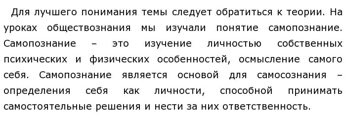 Автор говорит о самопознании как об изучении личностью собственных психических и физических особенностей, осмыслении самого себя.