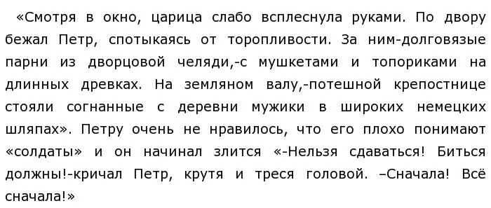 С чего началось детство Петра? Он был выбран правителем государства, как и его брат Иван. Но так как они были ещё детьми, всеми верховными правами обладала их старшая сестра Софья. « В Москве стало два царя - Иван и Петр, и выше их-правительница, царевна Софья». В следующий раз, мы Петра уже видим повзрослевшим, но таким же активным и непоседливым ребенком в Преображенском. Его голос был глуховат, а немигающие глаза похожи на совиные. В этих эпизодах появляется очень важный герой – Алексашка Меньшиков, который в будущем станет другом, помощником и фаворитом царя. А пока что Алексашка обучает Петрушу хитрости и ловкости. Важной деталью всего детства Петра является его страсть к военным «штучкам». Герой безумно любил бегать по двору Преображенского дворца, играя в войну.