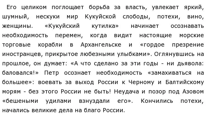 В Петре проявляются черты русского характера. Но проявляются у него по особенному, так как в нём сочетается несочетаемое: В одно и то же время он был вспыльчивым и хладнокровным, щедрым и бережливым, иногда жестоким, а порой и милосердным, требовательным и доброжелательным, грубым и нежным, страстным и безразличным. Все это создавало какой-то эмоциональный фон, на котором протекала вся деятельность Петра. Но главное-он был настойчивым в достижении цели, в основе его характера лежала твёрдость и решительность, сильная воля, рискованность, любовь к труду и огромная терпеливость. Он умел принимать достойно поражения, трезво оценивать ситуацию и признавать ошибки. Петр не боится подчиняться более умным и знающим военачальникам. Он жадно учится морскому,кузнечному и плотницкому делу. И его талант и обычное, « не царское» отношение к простому народу имело огромное значение в жизни страны. Он составил своих сподвижников не из тех заседевшихся Московских бояр, а из обычного крестьянского народа, неиспорченного народа. Он умел найти подход к людям, понимал обычных крестьянский мужиков и в портретной характеристике явно проявляется внешнее сходство с ними уже с малых лет: «все бегает, как простой», «весь в пыли, земле, потный, как мужичок», долговязый, неуклюжий, с косолапыми ступнями.