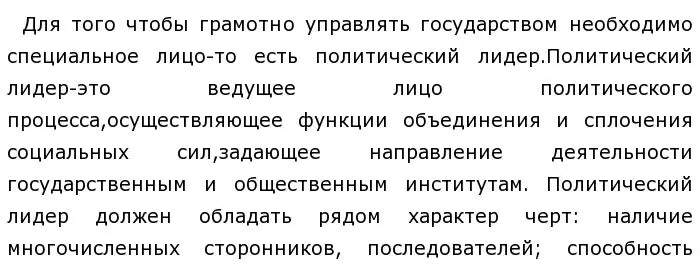 качеств он сможет эффективно управлять государством. Политическое лидерство разделяется на ряд видов: по уровню компетенции - общенациональный, региональный, местный; По способу легитимации власти - традиционный, легальный, харизматический; по стилю управления - авторитарный, демократический, либеральный, анархический. Также политический лидер обладает рядом функций: программная, интегративная, управленческая, защитная, коммуникативная. Таким образом, мы видим,что управление государством является действительно сложным искусством, для того чтобы правильно это сделать политический лидер должен обладать рядом функций и черт. Я полностью согласна с мнением Ж.Ж.Руссо. В школьном курсе "История" на уроках мы проходили Ярослава Мудрого. При его правлении Киевская Русь достигла своего расцвета и стала одним их сильнейших государств.Внешняя политика Ярослава была направлена на укрепление международного авторитета Руси. Вместе с хорошо подготовленной дружиной он совершил несколько военных набегов против врагов, а в 1036 году окончательно разгромил печенегов вместе со своей дружиной. Таким образом, мы видим, что государство переживет подъем только если у власти находит мудрый политический лидер, который правильно управляет государством. В журнале "Политическая наука" я прочитала статью про Петра Первого. Император был умным, любознательным и готовый к переменам человек. Благодаря его деятельности наша страна стала империей, значительно расширив свою и территорию. Своими правильными действиями в сфере управления государством, армией, Петр получил выход в Балтийское море и могущественный флот, а также выиграл в Северной войне. Таким образом,приведенные мною примеры показывают, что искусство управления государством, народом является поистине самым трудным искусством необходимо, чтобы у власти был действительно настоящий политический лидер, который будет качественно выполнять свою работу и хорошо управлять государством, что доказывает правоту суждения Ж.Ж.Руссо.