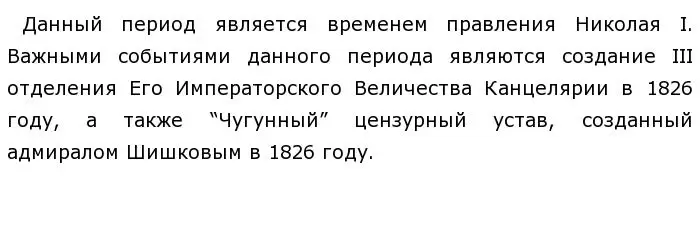 Еще одним важным событием стал “Чугунный ” цензурный устав 1826 года под руководством А.С. Шишкова. Целью стало прекратить распространение либеральных и революционных идей в обществе. Значительную роль в данном событии сыграл А.С.Шишков, военный и государственный деятель, государственный секретарь и министр народного просвещения. Одним из самых важных событий, совершенных Шишковым, было введение “Чугунного” устава, включающего в себя 230 статей и запрещающего публикации, в которых лица посягали на законную власть, выражали неблагоприятное отношение к монархическому строю или имелись рассуждения, касающиеся исторического процесса. Таким образом, благодаря созданию III отделения С.Е.И.В. и “Чугунному” уставу общественно-политическое движение ушло в подполье и стало преследоваться, усилилась цензура, следовательно, уменьшилась публикация многих печатных изданий, а также именно эти события характеризуют весь режим правления Николая I как консервативный, централизованный и ужесточенный.