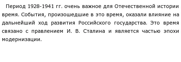 События произошедшие в период 1928-1941 гг., оказали серьёзное влияние на дальнейший ход российской истории. Они сыграли свою роль в развитии Российского государства, были заложены основы промышленности и во многом, благодаря этому, во время Войны удалось быстро адаптироваться к ведению военных действий и производить товары тяжелой промышленности. Эпоха правления И. В Сталина в целом стало периодом становления экономической независимости СССР, а данное время было ознаменовано повышением международного авторитета страны.