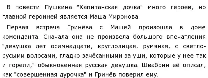 После смерти родителей Швабрин держит девушку в плену, принуждая, чтобы та вышла за него замуж. Но Маша остается верной Гринёву и себе. "Мне легче было бы умереть, нежели сделаться женою такого человека, каков Алексей Иванович", - произносит героиня."Странные происшествия" подвергли их любовь испытаниям. Молодые люди прошли их с достоинством и честью.