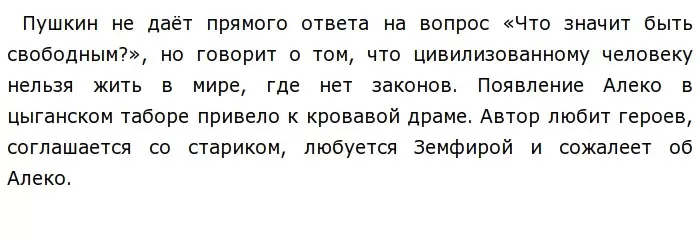 Ещё один важный факт подтверждает его эгоистичность - он не позволил своей возлюбленной быть с другим (на мой взгляд, человек, который по-настоящему любит, сделает всё, чтобы его вторая половинка была счастлива, даже если придется жертвовать своим счастьем).и тот же эпизод показывает, что предоставление свободы у молодого человека и кочевого народа разные. Для него свобода - это уйди от привычной жизни, переезжать с места на место, но он не готов терять контроль над кем-либо. Старый цыган о нём говорит так: «Ты не рождён для дикой доли, Ты для себя лишь хочешь воли».