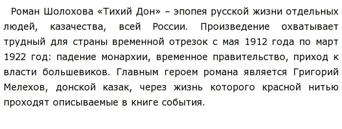 Через образ Григория Мелехова Михаил Шолохов прослеживает судьбу казачества в то трудное время. Описывая первую мировую войну, автор подчеркивает её несправедливый и антинародный характер.