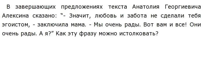“ - Значит, любовь и забота не сделали тебя эгоистом, - заключила мама. - Мы очень рады. Вот вам и все! Они очень рады. А я?” по тексту А. Г. Алексина. Сборник Цыбулько. Меня ждали шестнадцать лет.